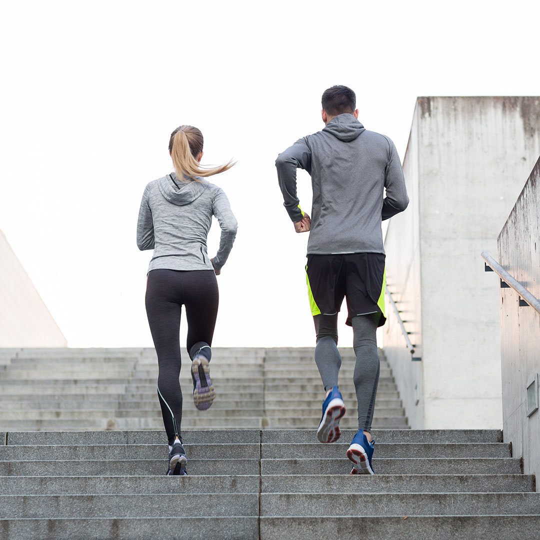 couple running upstairs on city stairs
